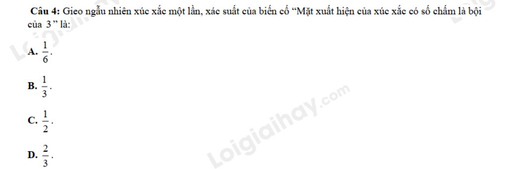 `->``bbB`$\\$Khi gieo `1` xúc xắc cân đối thì `6` mặt có khả năng xuất hiện bằng nhau. Ta nói xác suất xuất hiện mỗi mặt của xúc xắc bằng `1/6`$\\$ Các kết quả có khả năng xảy ra của biến cố: “Số chấm xuất hiện là bội của `3` ” là `3 ; 6`$\\$`=>`Xác suất của biến cố “Số chấm xuất hiện bằng `6`” là `1 /6 + 1 /6= 2 /6 = 1 /3`