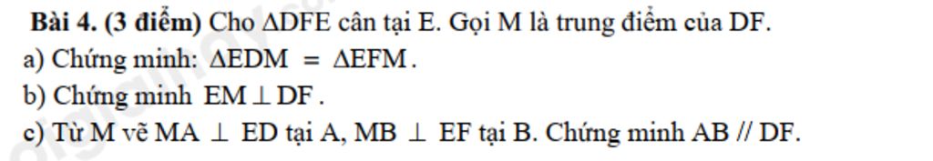 Bài 4. (3 điểm) Cho $\triangle$DFE cân tại E. Gọi M là trung điểm của DF.