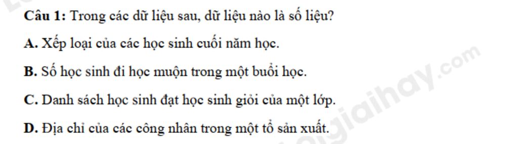 `B.` "Số học sinh đi học muộn trong một buổi học" là dữ liệu số liệu vì nó nói đến một số lượng cụ thể (số học sinh) và nó có thể đếm được