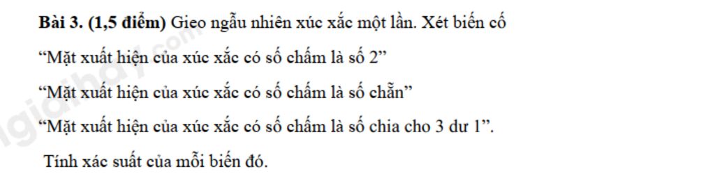 Xác suất của biến cố "Mặt xuất hiện của xúc xắc có số chấm là số chia cho 3 dư 1" là `2/6 = 1/3`