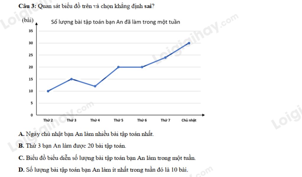 `***` Giải thích: Quan sát trên biểu đồ, có thể thấy thứ ba bạn An làm được `15` bài Toán `=>` Khẳng định `B` là khẳng định sai
