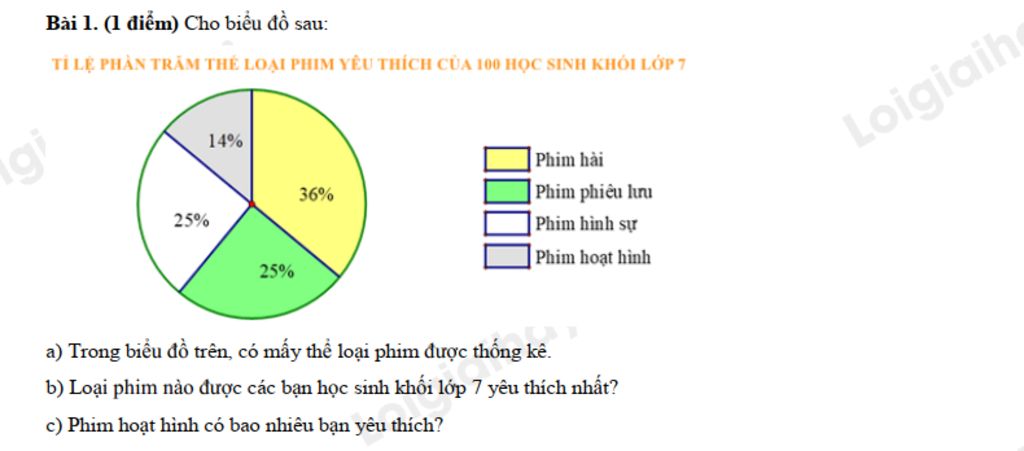 `c)` Phim hoạt hình có : `100.14%=14` bạn yêu thích .