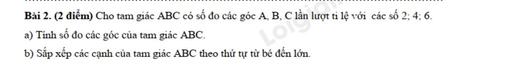 `a)` Gọi số đo các góc của `triangle ABC` lần lượt là `x , y , z ( x ,y,z ^@, x,y,z ∈ N** )`