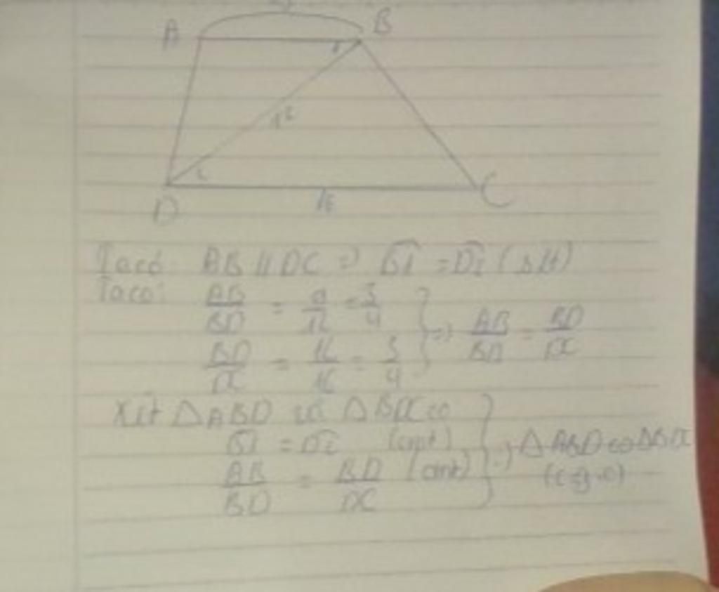 cho hình thang ABCD có AB//CD biết AB=9cm,BD=12cm,CD=16cm.chứng minh tam giác ABD đồng dạng tam giác BDC