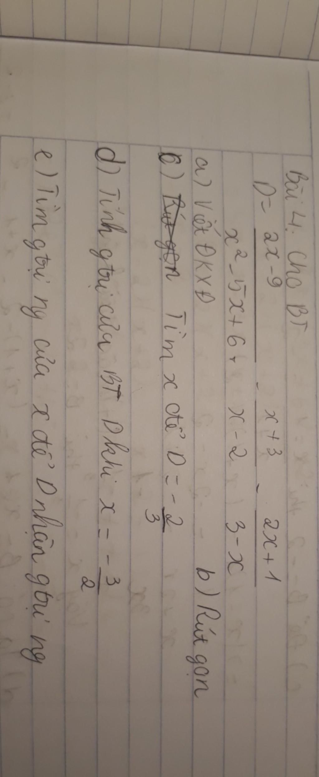 b) `D = (2x-9)/((x^2 -5x+6)) - (x+3)/(x-2) - (2x+1)/(3-x)`