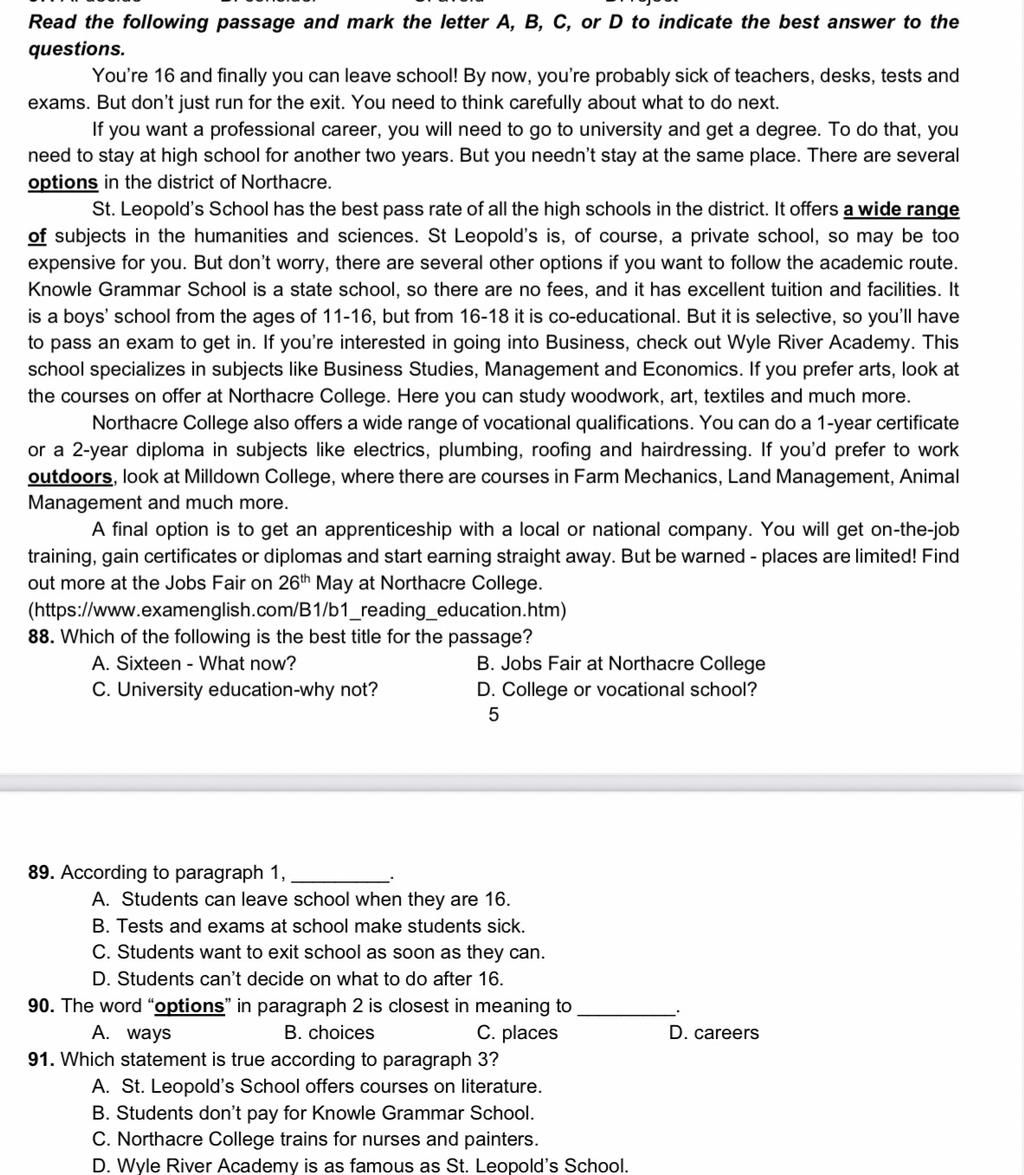 `-` Bài viết tập trung vào việc đưa ra các lựa chọn cho học sinh 16 tuổi sau khi rời trường, bao gồm cả con đường học thuật (đại học) và học nghề.