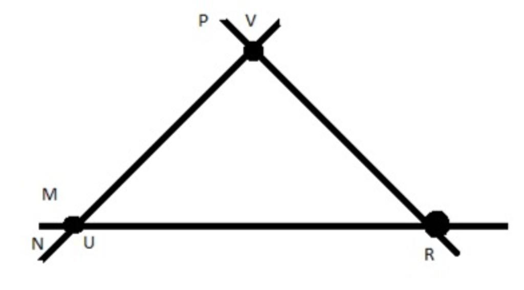 Vẽ điểm U nằm trên cả hai đường thẳng m, n và không thuộc đường thẳng p ; điểm V thuộc cả hai đường thẳng n, p và nằm ngoài đường thẳng m ; hai đường thẳng p, m cùng đi qua điểm R còn đường thẳng n chứa điểm R