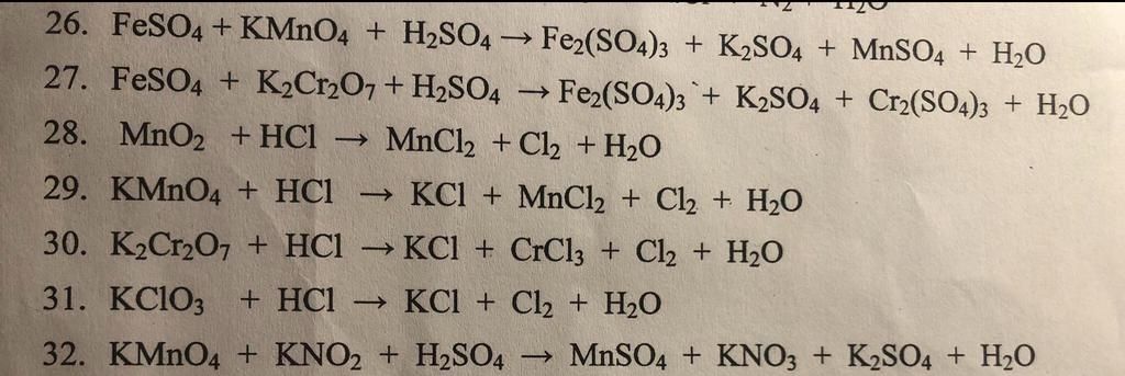 `->`$2KMnO_4+16HCl \to 2KCl+5Cl_2+2MnCl_2+8H_2O$