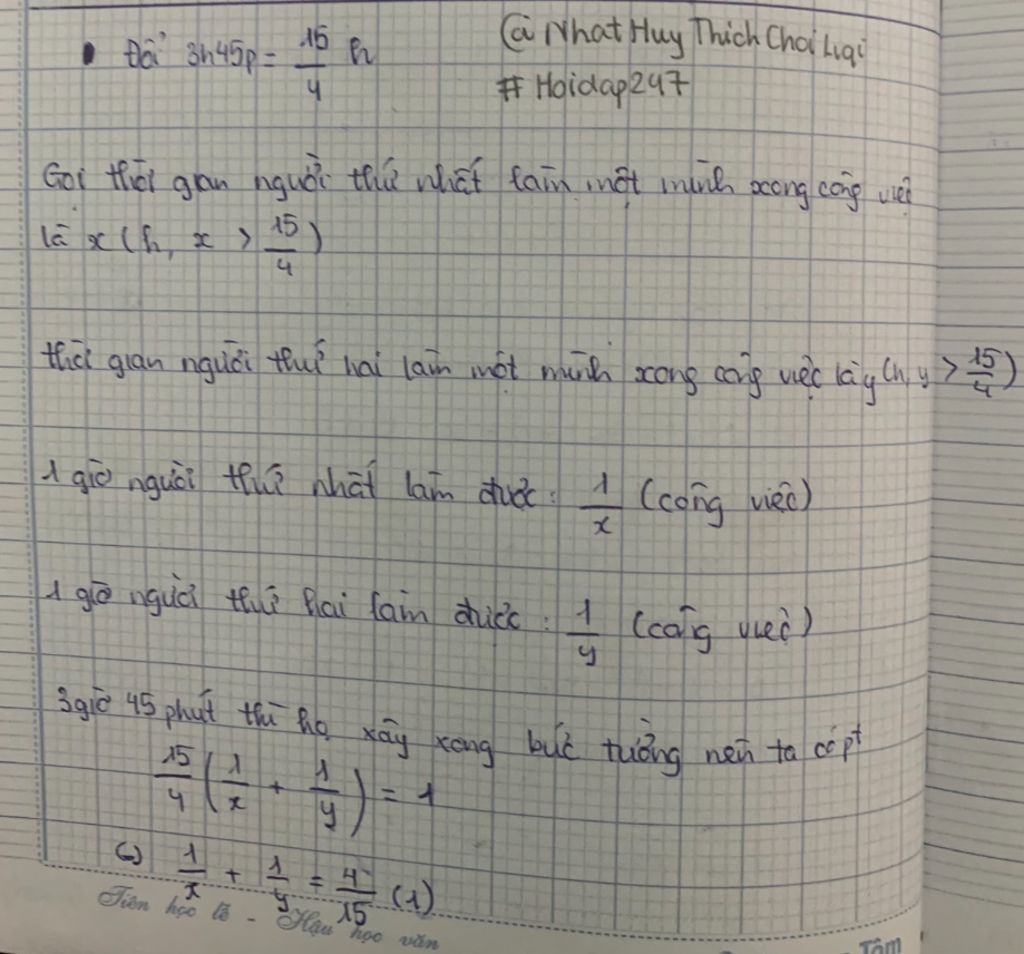 `=>` trong `1` giờ hai người thợ xây được : `4/15` bức tường nên ta có phường trình :