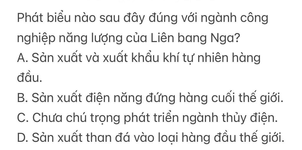 Phát biểu đúng về ngành công nghiệp năng lượng của Nga là:A.Sản xuất và xuất khẩu khí tự nhiên hàng đầu thế giới