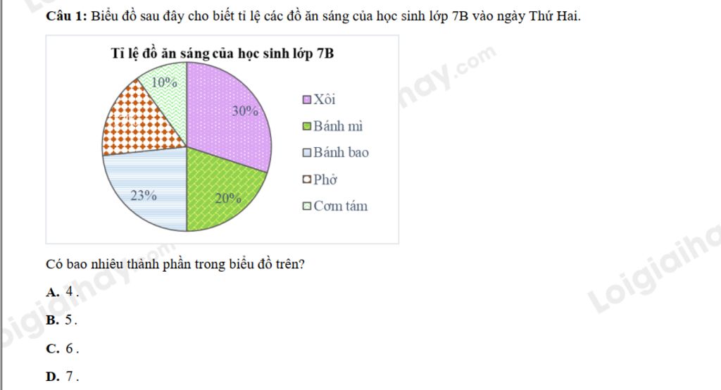 Câu 1: Biểu đồ sau đây cho biết tỉ lệ các đồ ăn sáng của học sinh lớp 7B vào ngày Thứ Hai.