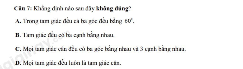 `C.` Sai vì tam giác cân thì hai cạnh kề với góc cân và hai góc ở đấy mới bằng nhau.