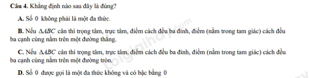`D.` Sai vì số `0` được gọi là `1` đa thức. Gọi là đa thức `0` và đa thức này không có bậc.