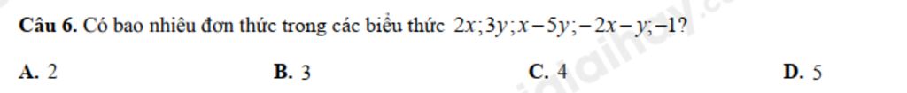 `@` Trong các biểu thức 2x;3y;x-5y;-2x-y;-1 thì có `3` đơn thức là `2x;3y;-1`