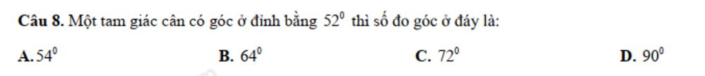`@` Một tam giác cân có góc ở đỉnh bằng 52°
