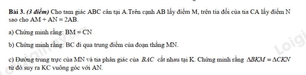 Bài 3. (3 điểm) Cho tam giác ABC cân tại A. Trên cạnh AB lấy điểm M, trên tia đối của tia CA lấy điểm N
