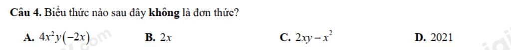 `=>` Biểu thức của đáp án A,B,D là những đơn thức