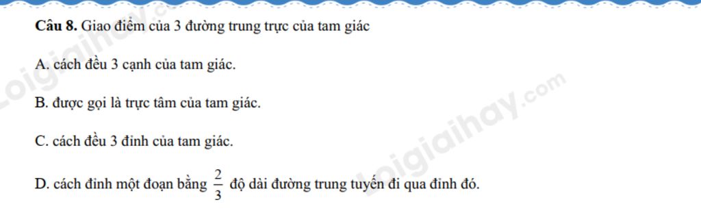 `@` Lý thuyết: giao điểm `3` đường trưng trực: Giao điểm của `3` đường trung trực của tam giác cách đều `3` đỉnh của tam giác.