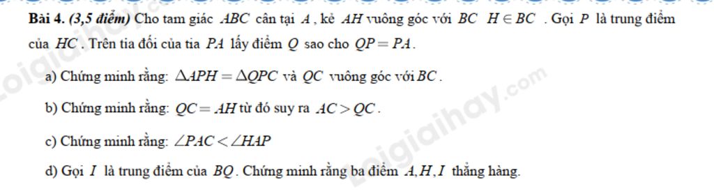 Bài 4. (3,5 điểm) Cho tam giác ABC cân tại A,kẻ AH vuông góc với BC HeBC . Gọi P là trung điểm HC.