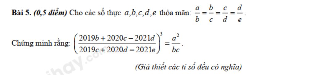Bài 5. (0,5 điểm) Cho các số thực a,b,c,d,e thỏa mãn $\frac{a}{b}$= $\frac{b}{c}$= $\frac{c}{d}$= $\frac{d}{e}$