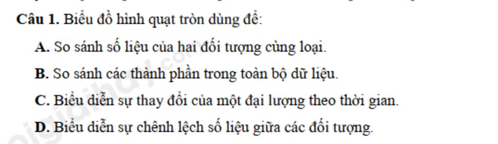 ⇒ Biểu đồ quạt tròn dùng để so sánh các thành phần trong toàn bộ dữ liệu