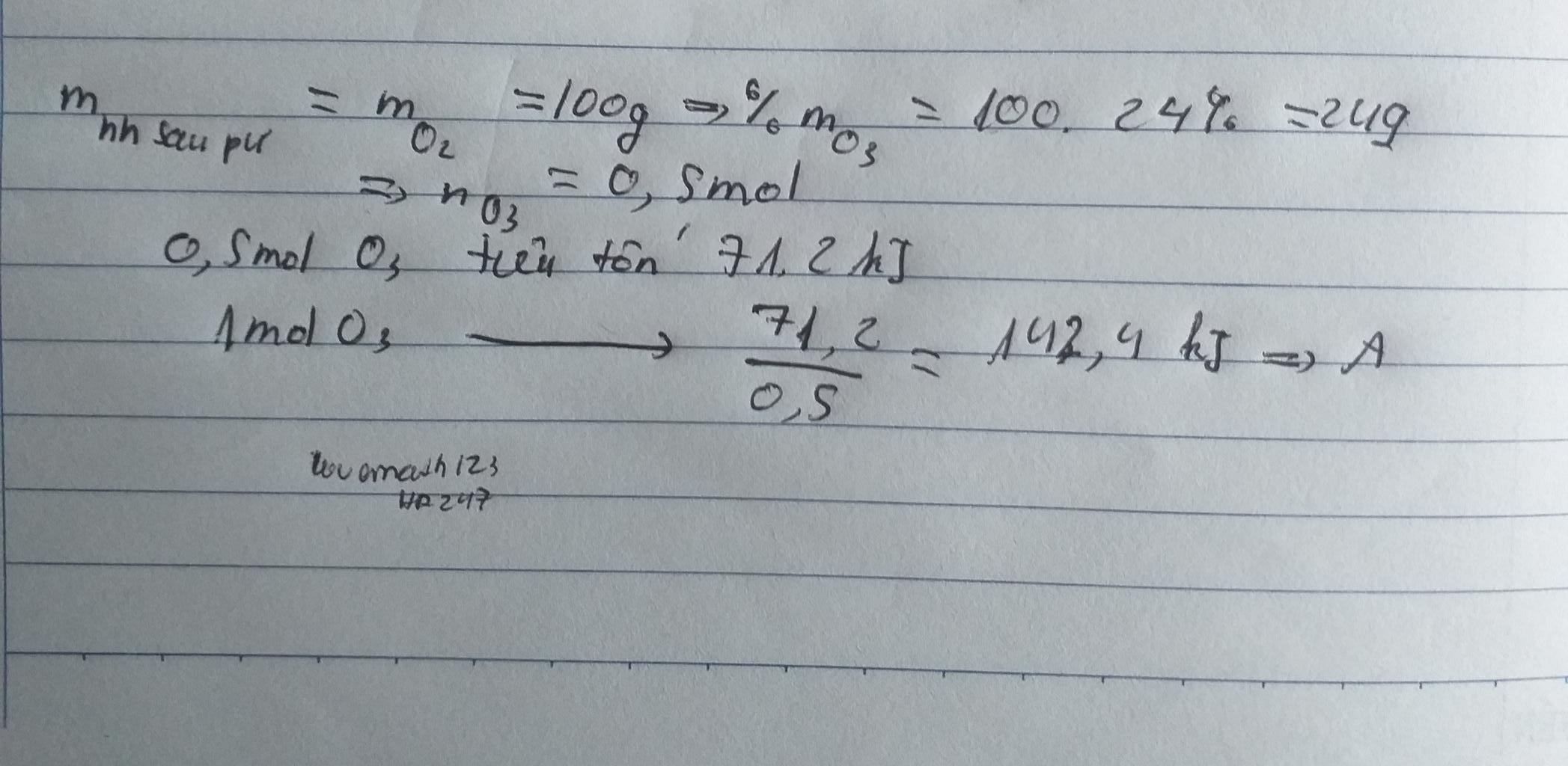 Hỗn hợp thu được có chứa `24%` ozone về khối lượng, tiêu tốn `71,2 kJ`. Nhiệt tạo thành