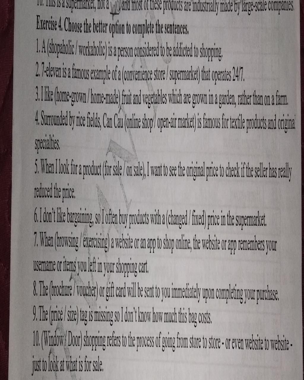 `***` Dựa vào nghĩa câu: Tôi không thích mặc cả nên thường mua các sản phẩm với giá cố định (giá gốc) ở siêu thị.