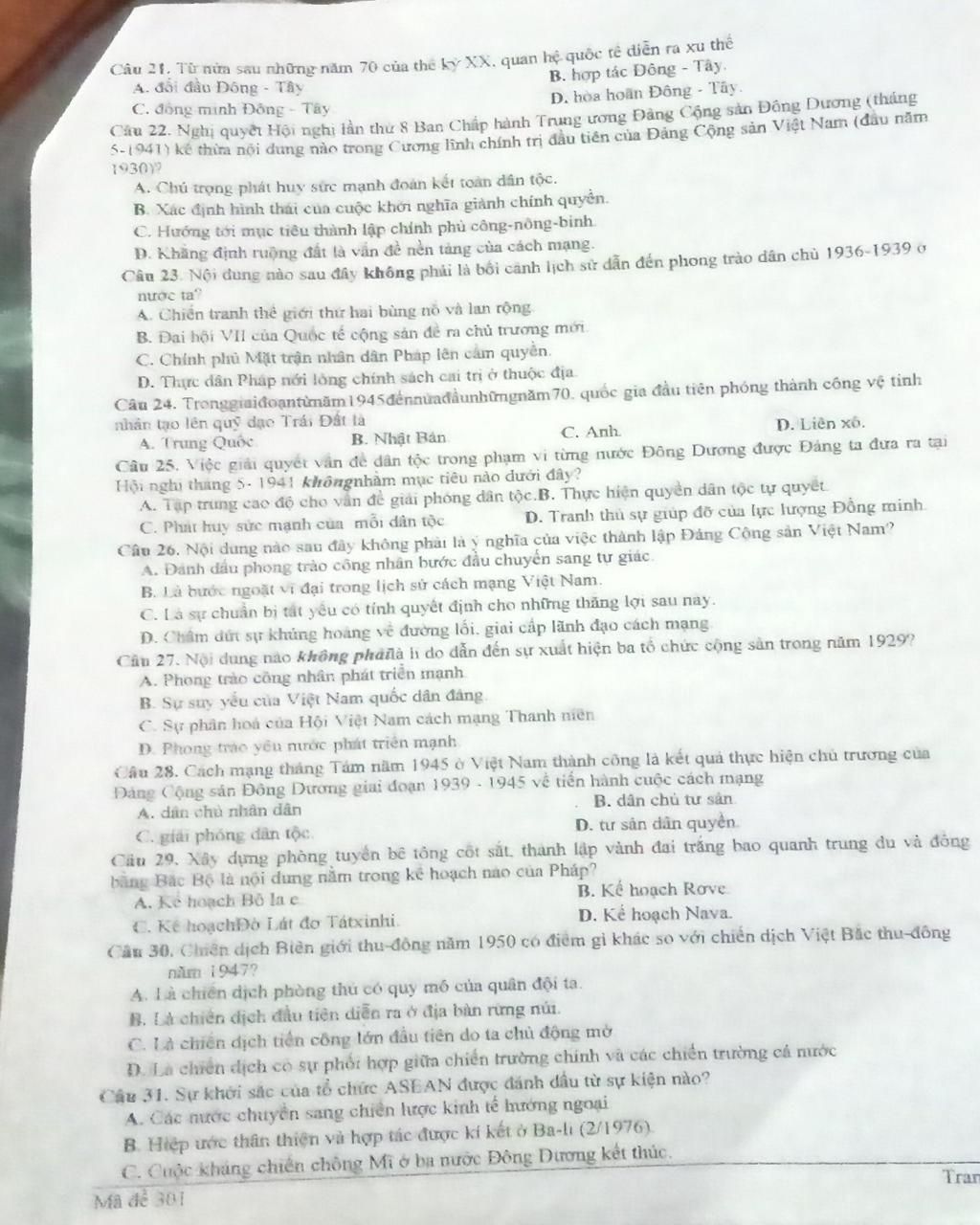 Câu 2. Tủ nửa sau những năm 70 của thế kỷ XX, quan hệ quốc tế diễn ra xu thế