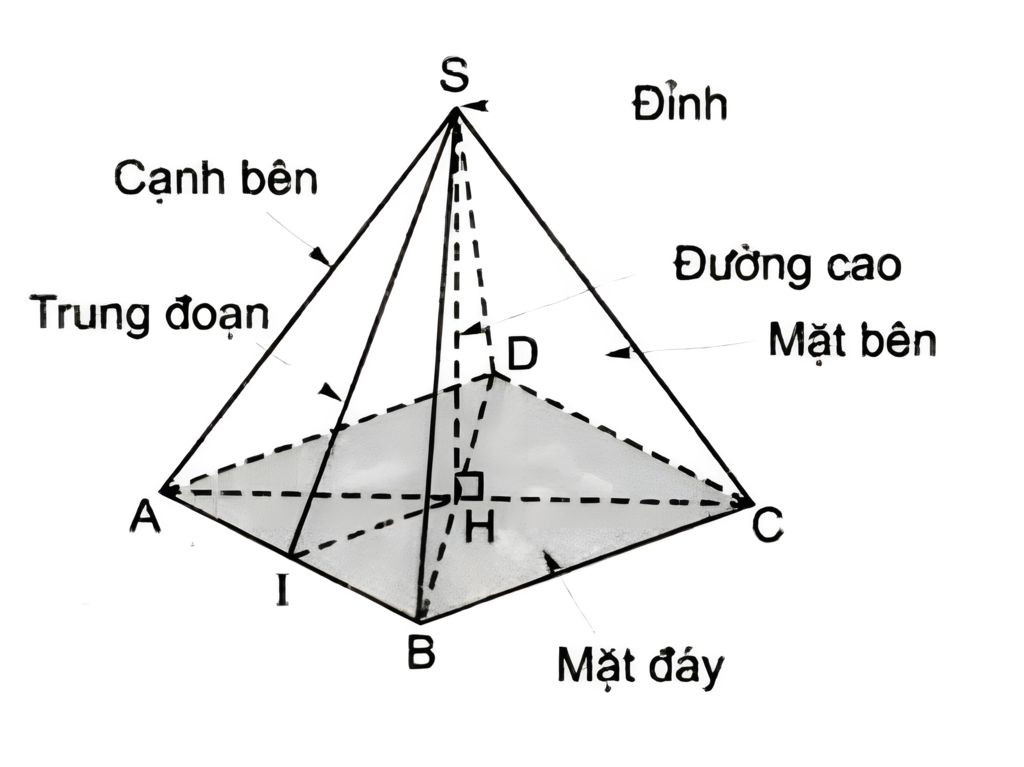 `->` Hình chóp đều được bao bọc bởi mặt đáy là 1 hình đa giác và các mặt bên là các hình tam giác cân bằng nhau có chung đỉnh.