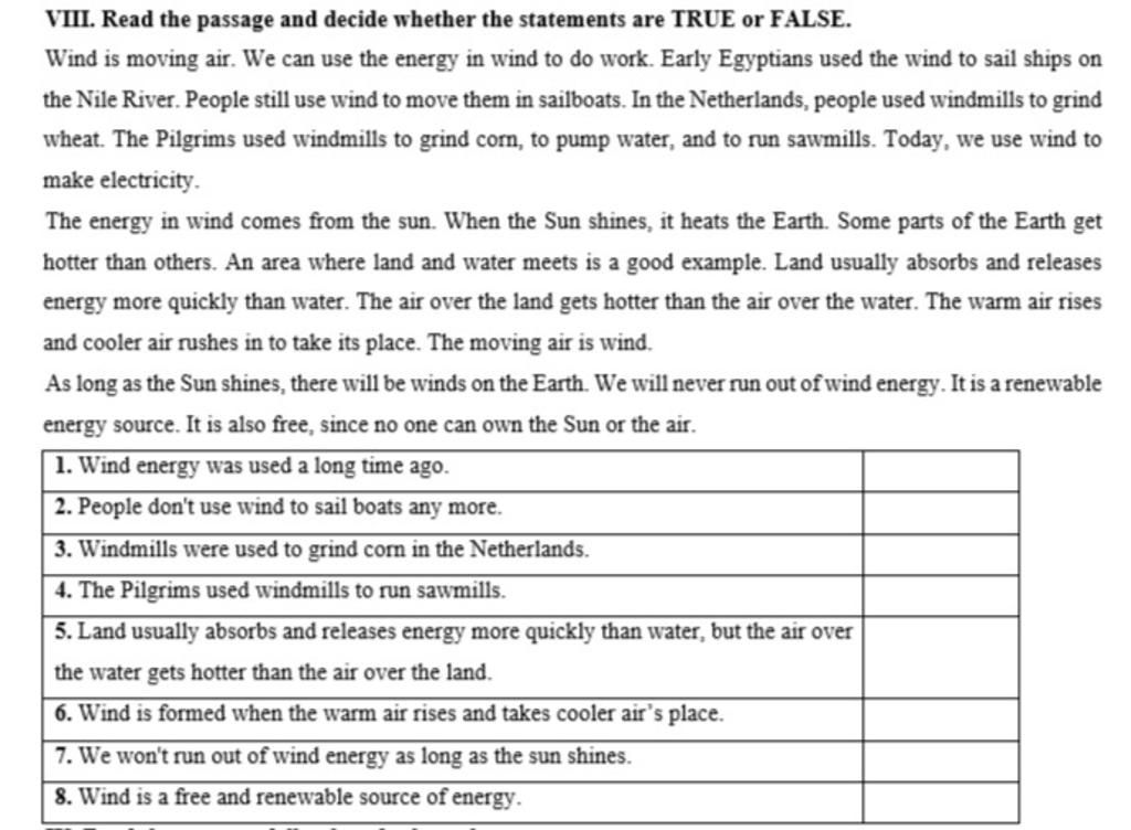 → "Gió đã được sử dụng từ lâu" là đúng bởi vì trong đoạn văn có nhắc tới Người ai cập cổ xưa sử dụng gió để trèo thuyền: "Early Egyptians used the wind to sail ships on the Nile River."