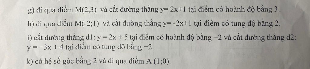 Câu g b vẽ điểm M(2;3) ra sẽ thấy đường thẳng: y=-3x+9 đi qua M