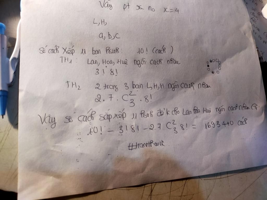 Một nhóm gồm 11 học sinh trong đó có ba bạn Lan,Hoa,Huệ tham gia một trò chơi đòi hỏi 11 bạn xếp thành một vòng tròn.Hỏi có bao nhiêu cách xếp sao cho ba bạn Lan,Hoa,Huệ khong bạn nào được xếp cạnh nhau