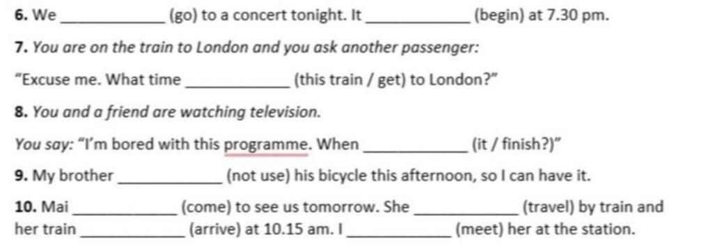 $\text{10.}$$\text{Mai is coming to see us tomorrow. She travels by train and her train arrives at 10:15. I am meeting her at the station.}$