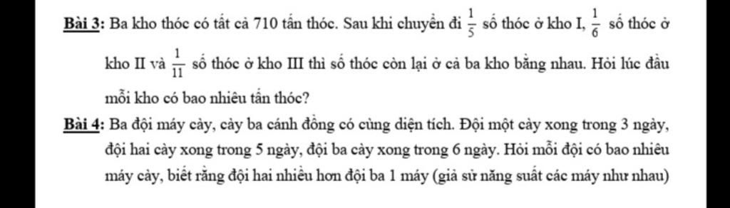 Vì diện tích các cánh đồng là như nhau nên số máy cày và số ngày hoàn thành công việc là hai đại lượng tỉ lệ nghịch, suy ra 3x = 5y = 6z.
