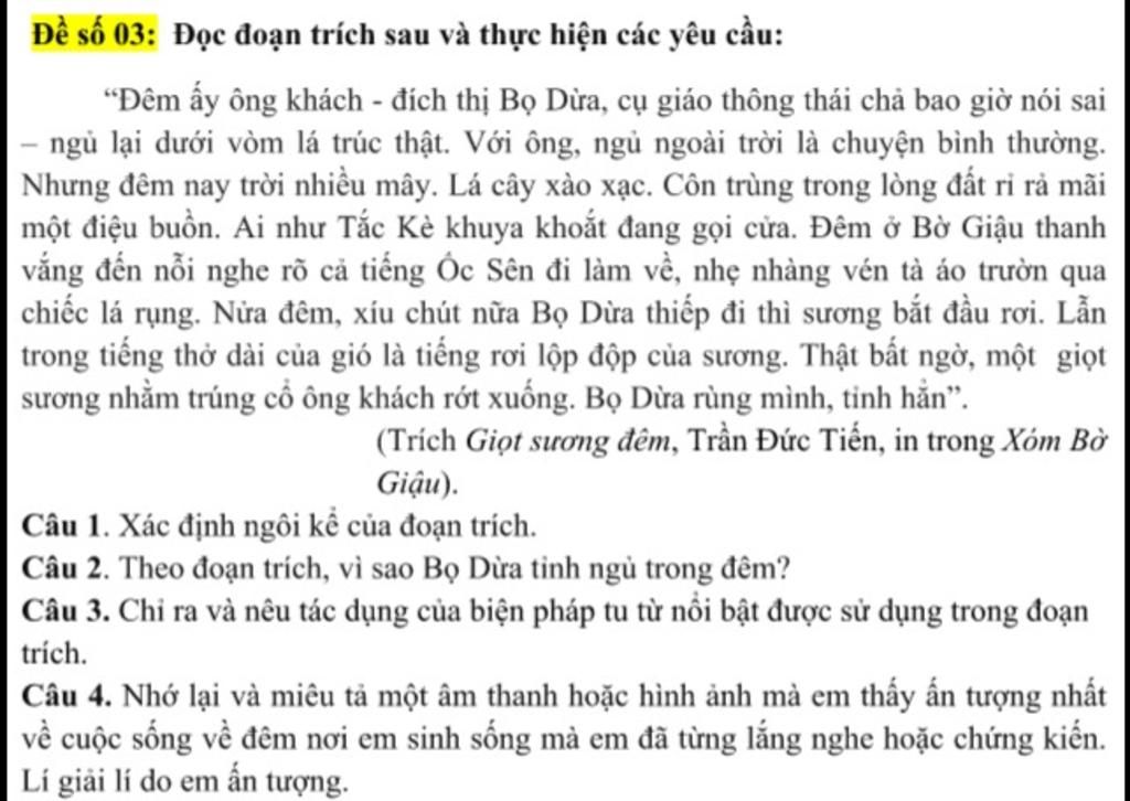 Câu 4:Em thấy tiếng ếch là ấn tượng nhất bởi vì mỗi lần nó kêu"ộp ộp" là giúp em giải tỏa những căng thẳng ,áp lực.Ngoài ra,nó còn giúp em thư giãn mỗi buổi tối học bài xong.