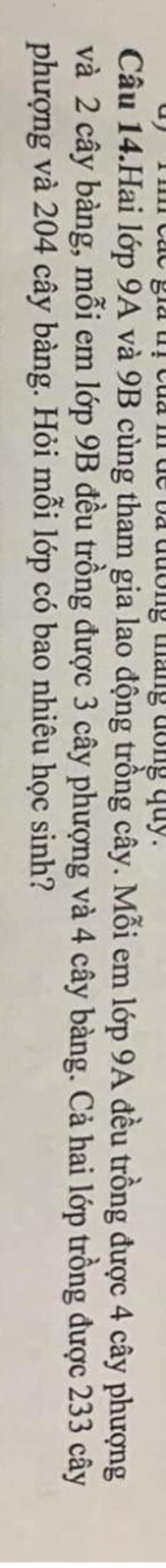 Mỗi em lớp `9A` trồng được `4` cây phượng còn lớp `9B` thì trồng được `3` cây phượng và tổng cây phượng trồng được của hai lớp là `233` cây nên: