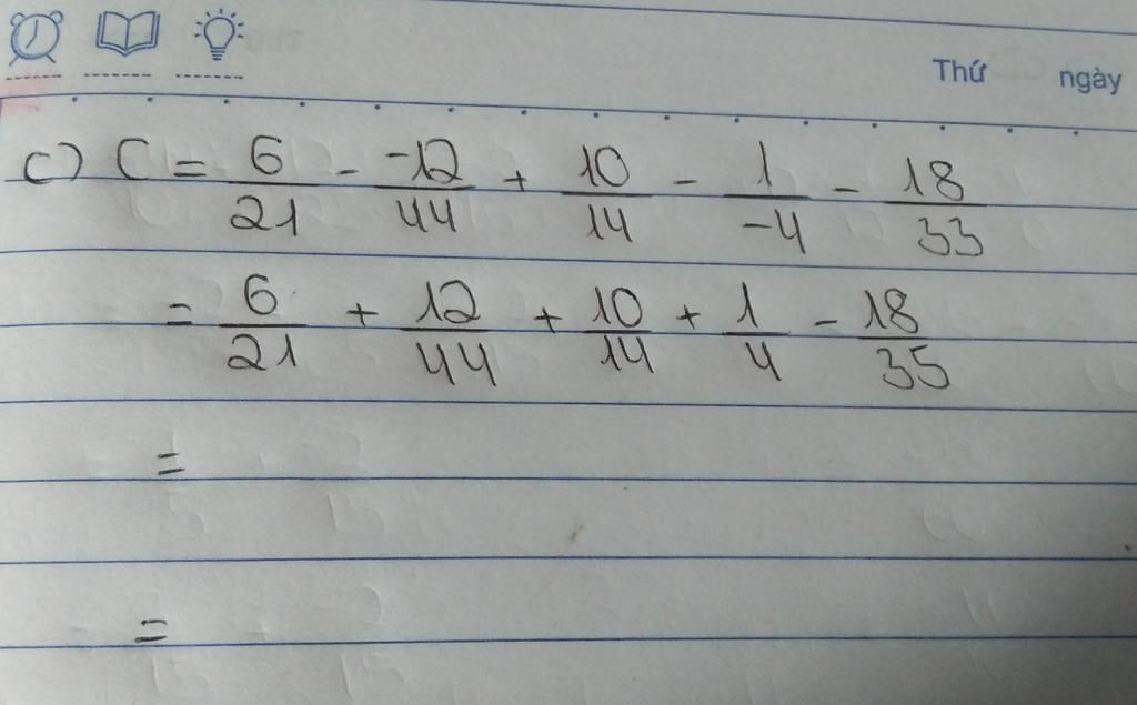 `C=6/21- (-12)/44 +10/14 - 1/(-4) -18/33`