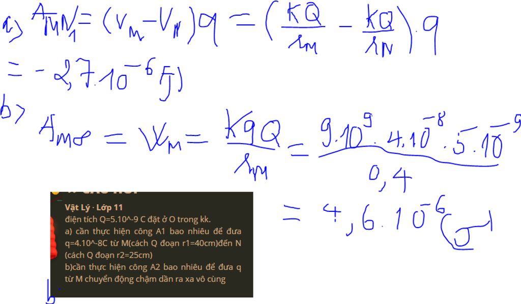 a) cần thực hiện công A1 bao nhiêu để đưa q=4.10^-8C từ M(cách Q đoạn r1=40cm)đến N (cách Q đoạn r2=25cm)