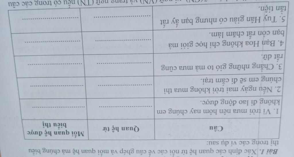 \begin{array}{|c|c|c|}\hline \text{Câu}&\text{Quan hệ từ}&\text{Mối quan hệ từ biểu thị}\\\hline \text{1. Vì trời mưa nên chúng em không đi lao động được}&\text{Vì...nên}&\text{Biểu thị quan hệ Nguyên nhân- Kết quả}\\\hline \text{2. Nếu ngày mai trời không mưa thì chúng em sẽ đi cắm trại}&\text{Nếu...thì}&\text{Biểu thị quan hệ Giả thiết - Kết quả}\\\hline \text{3. Chẳng những gió to mà mưa cũng rất dữ}&\text{Chẳng những...mà }&\text{Biểu thị quan hệ Tăng tiến}\\\hline \text{4. Bạn Hoa không chỉ học giỏi mà bạn còn rất chăm làm}&\text{Không chỉ...mà}&\text{Biểu thị quan hệ Tăng tiến}\\\hline \text{5. Tuy Hân giàu có nhưng bạn rất tằn tiện}&\text{Tuy...nhưng}&\text{Biểu thị quan hệ từ Tương phản}\\\hline\end{array}
