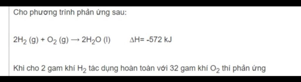 $\Rightarrow Q_{\text{toả}}=\dfrac{572}{2}=286 kJ$ vì ban đầu chỉ có $1$ mol $H_2(g)$ phản ứng với $0,5$ mol $O_2(g)$