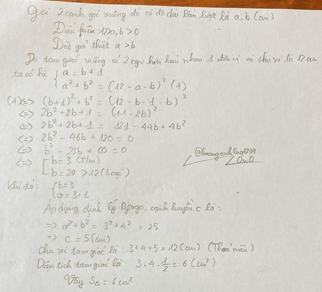 Một tam giác vuông có hai cạnh góc vuông hơn kém nhau 1cm. Tính diện tích tam giác biết chi vi tam giác là 12cm