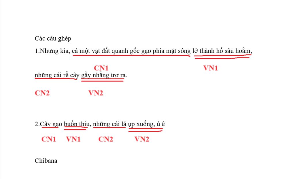Câu 6 : Chép lại các câu ghép có trong đoạn văn sau và phân tích những câu đó: Chiều nay, đi học về, Thương cùng các bạn ùa ra cây gạo. Nhưng kìa, cả một vạt đất quanh gốc gạo phía mặt sông lở thành hố sâu hoắm, những cái rễ cây gầy nhẳng trơ ra. Cây gạo chỉ còn biết tì lưng vào bãi ngô. Những người buôn cát đã cho thuyền vào xúc cất ngay ở khúc sông dưới gốc gạo. Cây gạo buồn thiu, những cái lá ụp xuống, ủ ê.