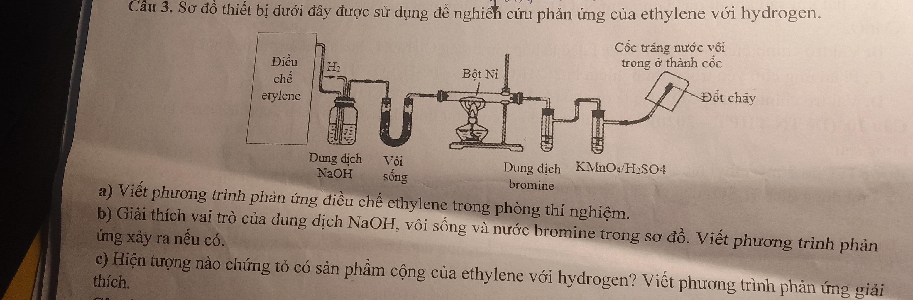 Hỗn hợp khí ethylene, hydrogen từ bình $NaOH$ được dẫn qua vôi sống để làm khô do $CaO$ có tính hút ẩm và không tác dụng với ethylene, hydrogen.