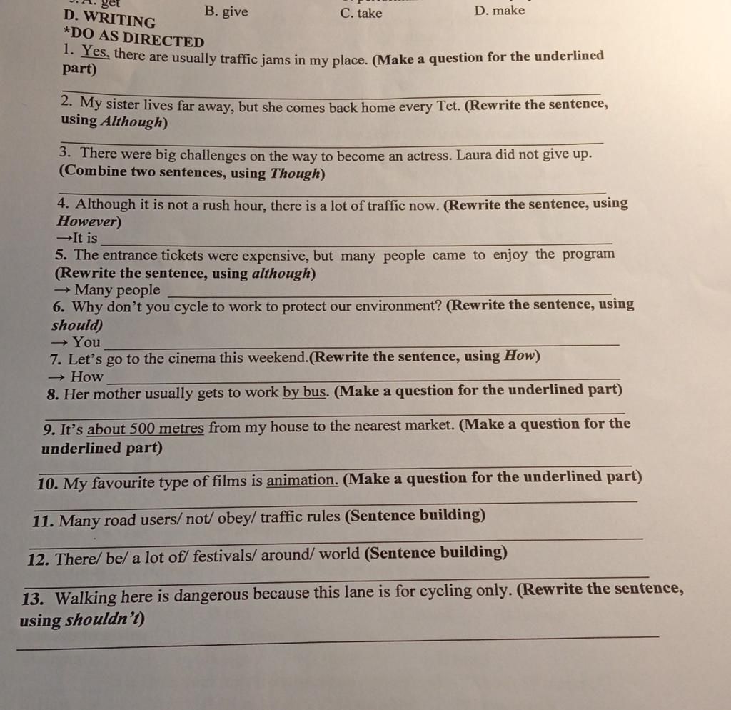 `+)` Mđề kết quả + although + mđề nguyên nhâow `6.` You should cycle to work to protect our environment.