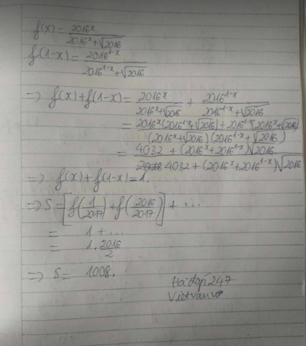 Cho hàm số `f_{x}=\frac{2016^{x}}{2016^{x}+\sqrt{2016}}` . Tính `S=f(\frac{1}{2017})+f(\frac{2}{2017})+...+f(\frac{2016}{2017})`