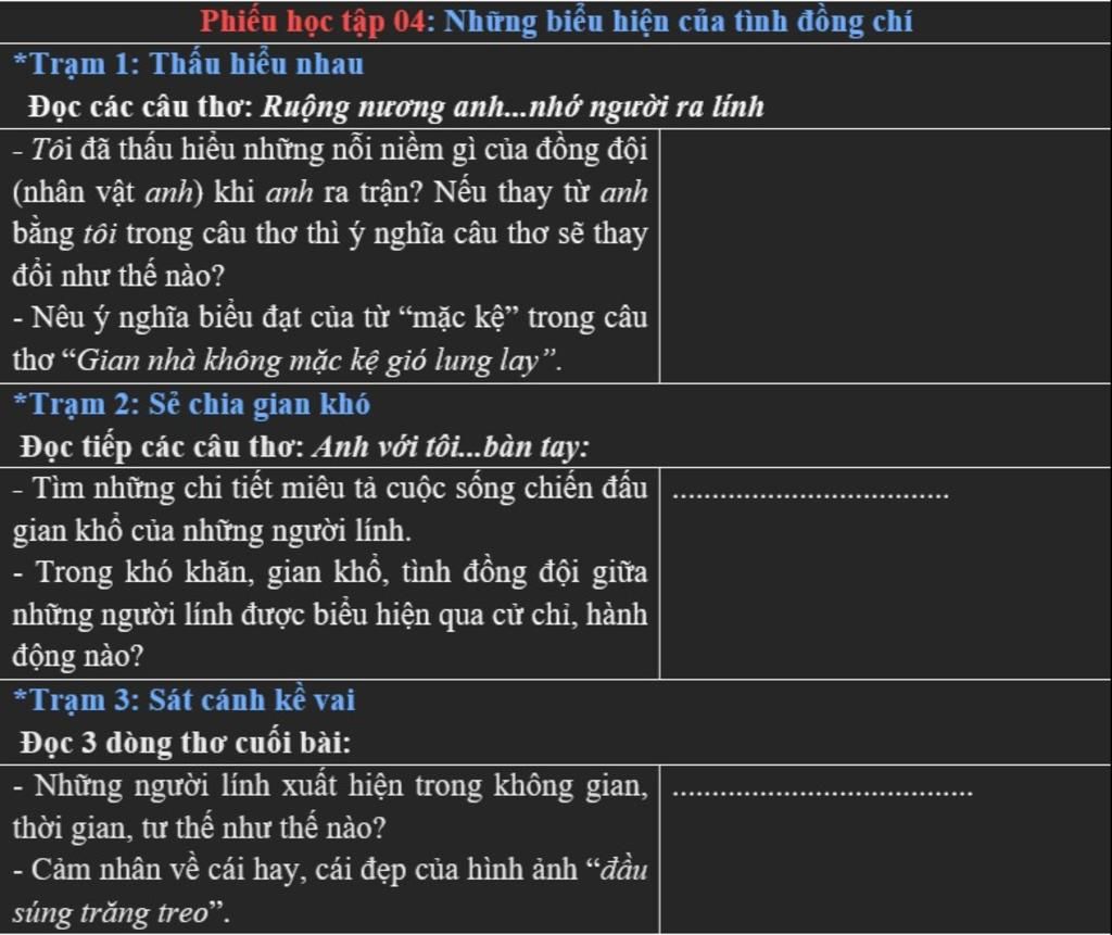 - Trong khó khăn gian khổ, tình đồng đội giữa những người lính được biểu hiện qua cử chỉ, hành động: "Thương nhau tay nắm lấy bàn tay". Đó là những cái nắm tay của sự cảm thông, chia sẻ; là hơi ấm của tình đồng chí, giúp nhau vượt lên tất cả.