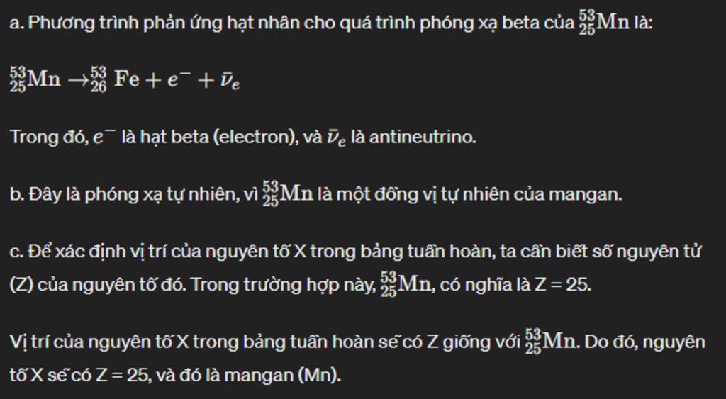 1, Trong tự nhiên, nguyên tố X có 3 đồng vị bền và 1 đồng vị không bền. Một trong các đồng vị là sản phẩm phân rã do phóng xạ beta của 53 Mn 25