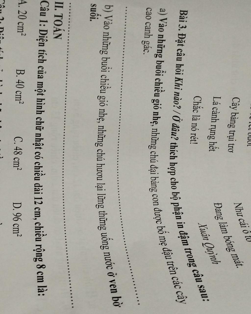 Bài 3:Đặt câu hỏi Khi nào?/Ở đâu ?thích hợp cho bộ phận in đậm trong câu sau:
