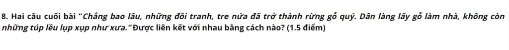 8. Hai câu cuối bài “Chẳng bao lâu, những đồi tranh, tre nứa đã trở thành rừng gỗ quý. Dân làng lấy gỗ làm nhà, không còn những túp lều lụp xụp như xưa.”Được liên kết với nhau bằng cách nào? (1.5 điểm)