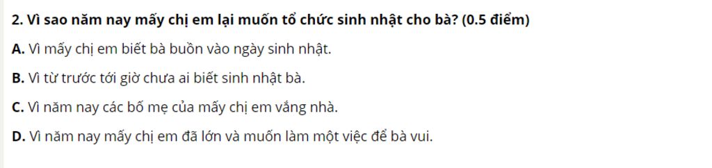 D. Vì năm nay mấy chị em đã lớn và muốn làm một việc để bà vui